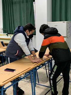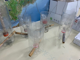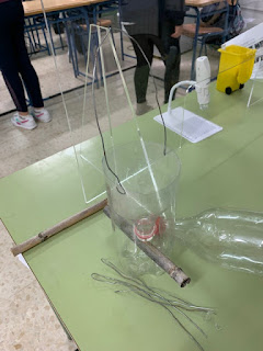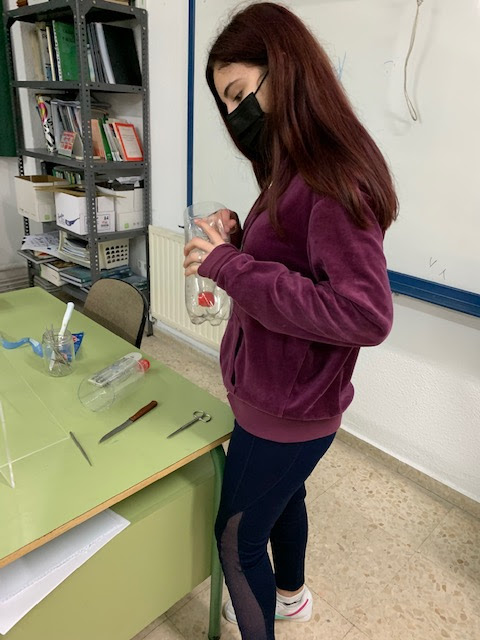 Los alumnos de 1º de ESO realizan una actividad de reutilización de las botellas de plástico. Se van a reutilizar para hacer comederos y bebederos para los pájaros del patio del Centro.